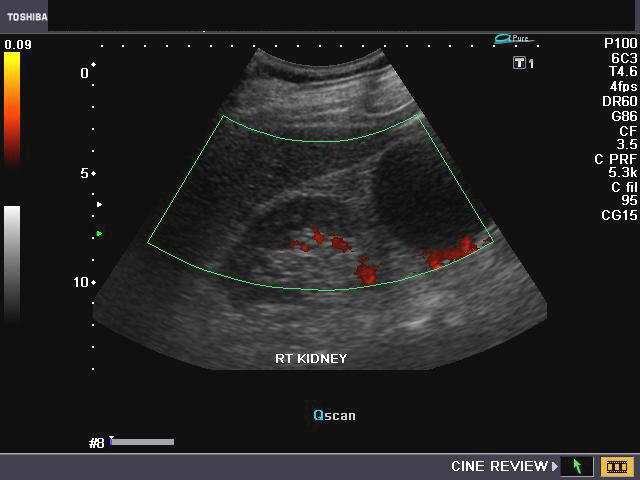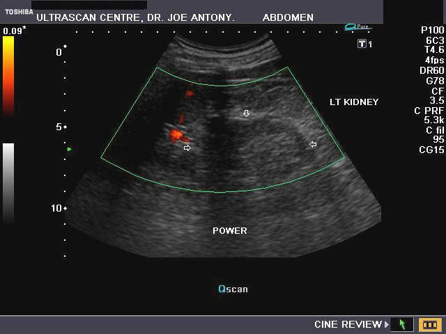 This elderly male patient presented with symptoms of medical renal disease. Sonography of the kidneys revealed: 1) bilateral echogenic (hyperechoic renal cortex) kidneys 2) both kidneys appear small in size (atrophic) 3) reduced thickness (thinning) of renal cortex (10mm.) 4) reduction in cortico-medullary differentiation 5) Color doppler imaging of the kidneys revealed reduced flow in both kidneys. These ultrasound images are diagnostic of chronic medical renal disease (or chronic renal failure). All ultrasound images above (taken using Toshiba Nemio-XG Color Doppler imaging system, by Joe Antony, MD, India.