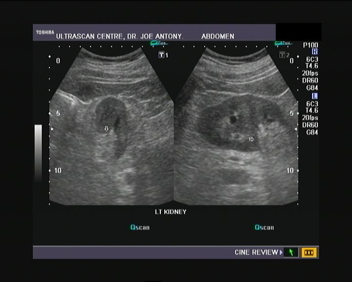 this 58-year-old Male patient underwent routine sonography for non-specific complaints including mildly elevated serum creatinine and blood urea. Sonography shows multiple small cysts ranging from 3 mm up to 12 mm in size in both kidneys. Both kidneys are literally studded with these minute cystic lesions (more than 20 in each kidney) with many of them showing the presence of milk of calcium. In addition, there are also multiple minute calculi ranging from 2 to 4 mm in size. This is an unusual presentation of autosomal dominant polycystic kidney disease ( see the ultrasound images above) and could represent the initial stages of the disease. Both kidneys also show moderate enlargement with sizes of 11 x 6 cm.