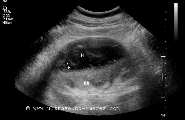 The ultrasound images above show a large subcapsular hematoma of the right kidney in a case of blunt abdominal trauma. Sonography shows a 9 x 4.5 cms. sized markedly hypoechoic collection in the subcapsular part of the right kidney in an oval shape. The collection compresses upon the intact part of the right kidney, (arrows), without changing the reniform contour of the kidney. Smaller subcapsular (intracapsular) hematomas appear crescent shaped. The renal hematoma shows sharp outer margins suggesting that it is limited by the renal capsule. The pelvicalyces appear intact. Such renal injuries may be classified as grade-1 renal trauma. However, CT evaluation is advisable to detect the extent of renal laceration if any. Color Doppler imaging would help in determining the viability of the kidney when large renal hematomas of this nature cause compression and resultant ischemia to the organ. Ultrasound images are courtesy of Dr. Ravi Kadasne, M.D., UAE.