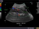 Sonographic imaging was done on this patient who underwent renal transplant some time ago. The transplanted kidney is seen in the left iliac fossa in these ultrasound images. The first image shows a cystic lesion (anechoic) in the lower pole of transplanted kidney. The 2nd image also shows mild dilation of the renal pelvis and upper ureter in this kidney. Color doppler images reveal swirling flow pattern within the cystic lesion. There is also evidence of a communication of the lesion with a segmental artery. Real time imaging also revealed to and fro flow between the lesion and the artery. Diagnosis: pseudoaneurysm in transplant kidney. Images courtesy of Dr. Jaydeep Gandhi, Mumbai, India.