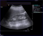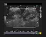 This patient has a history of UTI or urinary tract infection. Both kidneys show renal parenchymal edema evident as early loss of cortico-medullary differentiation with swelling of the renal parenchyma suggesting renal inflammation or pyelonephritis. In additon, observe the hypoechoic nature of the renal tissue. In late cases of pyelonephritis there may be focal abscesses and scarring of the renal cortex. Focal hypoechoic areas may also be seen in acute pyelonephritis.