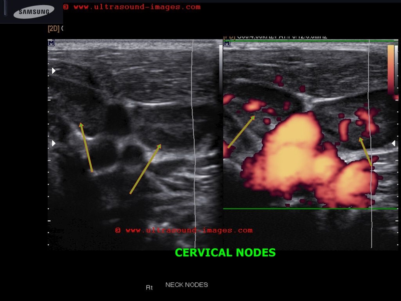 Known case of non Hodgkins lymphoma. Sonography of the neck shows two cevical nodes with typical features.