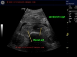 This elderly male patient, a known case of non Hodgkin's lymphoma has a large retroperitoneal mass on ultrasound imaging of the abdomen. Non Hodgkin's lymphoma is known to cause a lymph node conglomerate mass as in this case, to surround the aorta and inferior vena cava encasing these two major vessels. The arteries emerging from the aorta, namely the renal arteries and the celiac artery are also encased by the lymph node mass- the "sandwich sign". This condition is called retroperitoneal lymphoma.