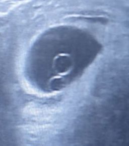 The above ultrasound images reveal reduction of early quadruplet gestation by ablation (using KCl) of 2 fetuses, converting it successfully to a twin gestation (image on right half). Images courtesy of Dr. Udaya Kumar, Chennai, India.