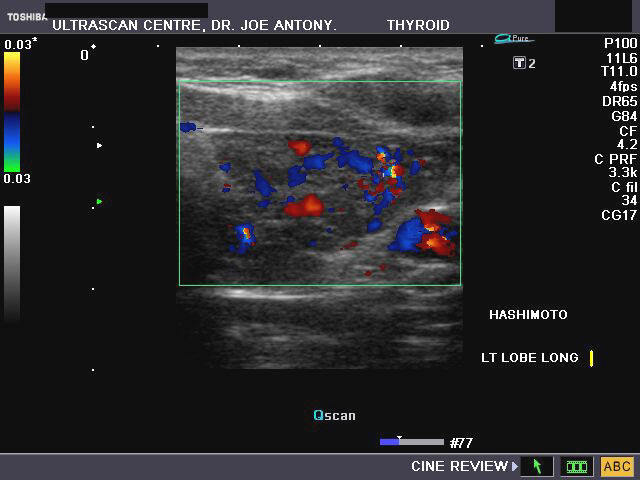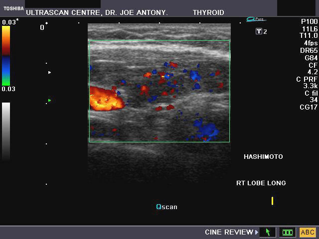 Sonography of the thyroid gland in this middle aged female patient reveal: 1) hypoechoic thyroid gland 2) coarse echotexture of the gland 3) fine linear echoes within the thyroid parenchyma s/o fibrosis 4) Color doppler imaging reveals augmentation of the vascularity of the thyroid gland. These ultrasound images are diagnostic of Hashimoto's thyroiditis. Images taken using a Toshiba Nemio- XG color doppler machine. Hashimoto's thyroiditis is often a cause of decreased thyroid function or hypothyroidism and is thus a causative factor in the development of obesity. Both type1 and type 2 diabetes may be associated with Hashimoto's thyroiditis.
