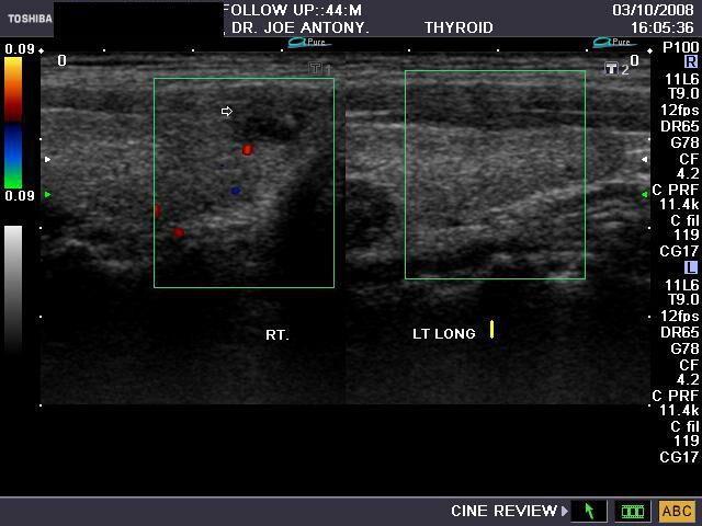 The above ultrasound and color doppler images reveal multiple cystic lesions in both lobes of the thyroid. There is also evidence of few nodular, solid masses within the lobes. Color doppler imaging reveals multiple vessels around the lesions. These images suggest multinodular goiter, more of a cystic variety.
