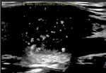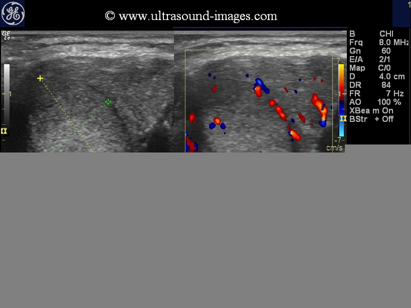 Sonography of the thyroid was done in this young girl. There is a large, solid, echogenic, homogenous oval nodule with a hypoechoic halo around the lesion, in the right lobe of thyroid. The lesion is solitary, shows no cystic areas and has a rim of vessels entering it's central area. These ultrasound images are diagnostic of a benign follicular adenoma of the thyroid. Note the similarity of the egg-shaped lesion to a sonographic image of the testes.