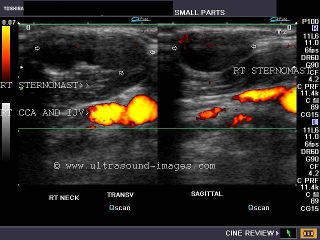 Sonography of the thyroid in this 1 yr. old female child revealed congenital absence of the entire thyroid. Note the empty fossae where the right and left lobes would normally lie. The carotid artery and jugular vein of both sides are seen in the color doppler images. These ultrasound and color doppler images suggest congenital agenesis of the thyroid.