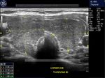 Right lobe thyroid with hypoechoic nodule and coarse, large calcification. Marked vascularity with chaotic vessels seen in the hypoechoic mass in the lower half of the right lobe.This middle aged (50 year old) female patient showed a markedly hypoechoic but solid mass in the lower half of the right lobe (1.2 x 1.5 cms.) with coarse calcification. This is a typical finding in ultrasound imaging of medullary carcinoma of the thyroid. Medullary carcinoma is typically seen in middle aged female patients. The marked vascularity of the lesion and chaotic vessels in the tumor are also suggestive of a malignant mass (in this case- medullary carcinoma) of the thyroid. Thyroid medullary caricnoma can metastatize to lymph nodes producing hypoechoic nodes. Usually the upper part of the thyroid lobe is affected in medullary carcinoma. Histopathological study confirmed this tumor to be medullary carcinoma. There is also a colloid nodule of the upper part of the right lobe.