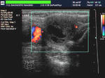 This was a middle aged female patient with suspected thyroid pathology. Ultrasound images show a relatively large, well encapsulated hypoechoic mass of 1.1 x 0.5 cms. in the posterior aspect of the right lobe of thyroid. The main differential diagnosis in this case is a parathyroid adenoma (right -lower). The color Doppler images show marked vascularity with an arc of vessels around the lesion. This is a highly suggestive sign of parathyroid adenoma. The other main differential diagnosis is "hot" autonomous nodule of the thyroid gland (less likely). The vessels show both arterial and venous flow within this lesion.