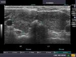 This teenaged female presented with a palpable and visible mass in the suprasternal region just below the thyroid. On sonography, the mass is homogenous in echotexture, measures 5.5 x 2.5 x 2.6 cms., relatively hyperechoic with echogenicity just less than the normal thyroid (which was well visualized). Color doppler imaging shows no vascularity in the mass. These ultrasound images suggest either an ectopic thymic mass or a subcutanous mass like lipoma. The mass was aspirated and proved to be a lipoma of the neck. Images taken using a Toshiba Nemio XG by Joe Antony, MD, India.